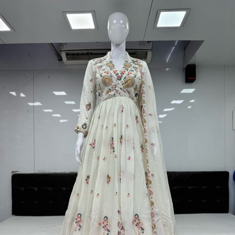 Ivory, with accents of pink, green, yellow, and gold Anarkali Dress