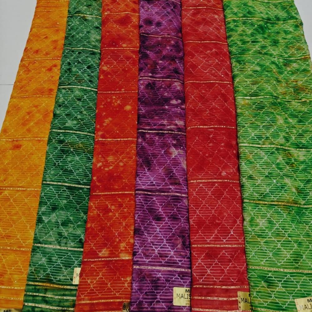 Vibrant shades including gold, green, orange, red, and purple. Fabric or Saree