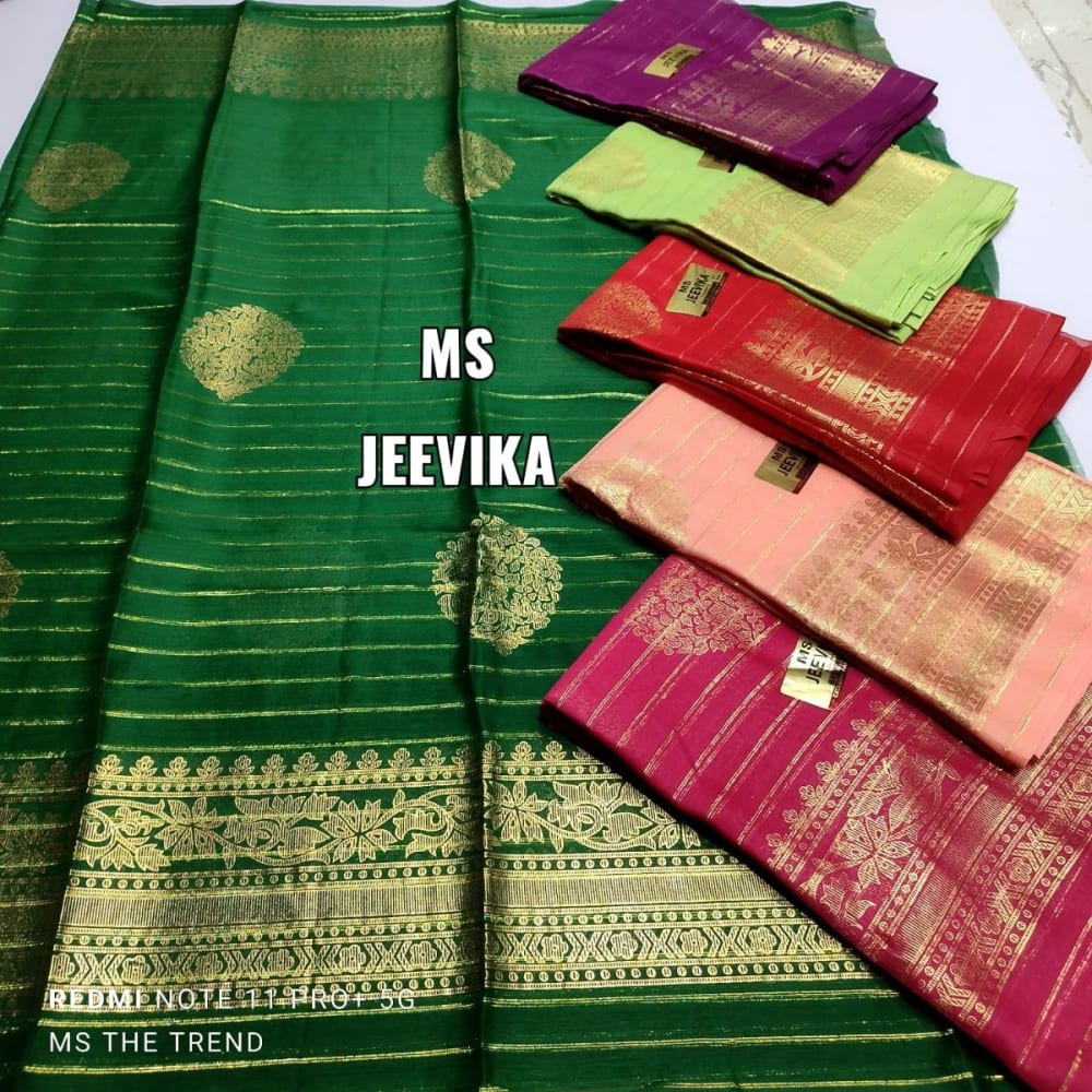 Green and gold, with additional colors in other pieces including purple, light green, red, peach and pink Saree