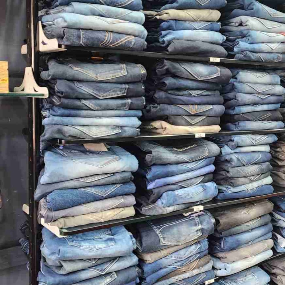 Various shades of blue, including light wash, medium wash, and dark wash with some gray tones. Jeans