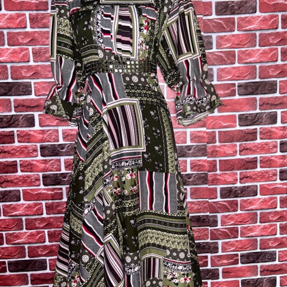 Olive green, black, gray, red, and white Dress