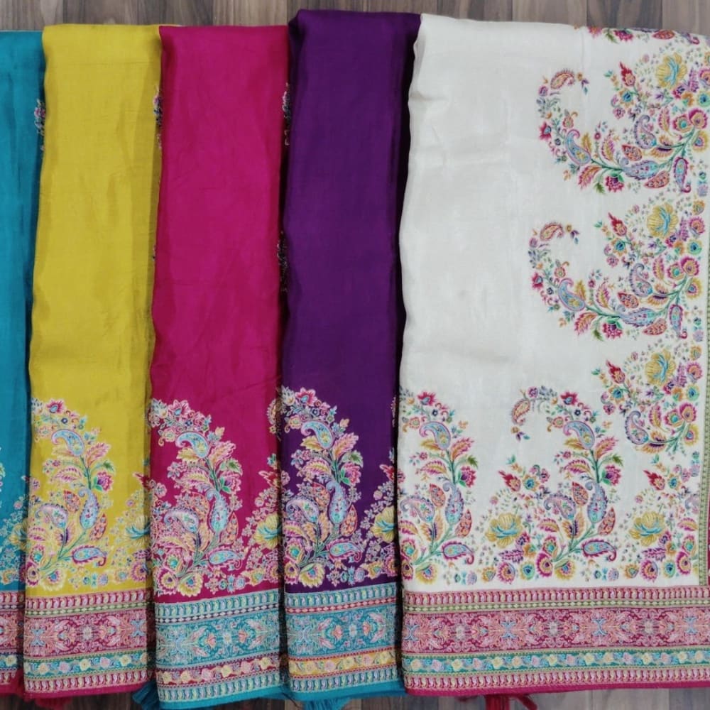 Vibrant shades like turquoise, yellow, pink, purple, and white with multi-colored embroidery. Sarees