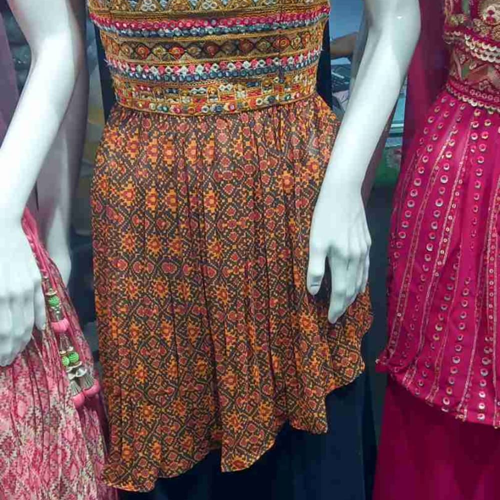 Brown, Orange, Yellow, with accents of Red, Blue and white Dress