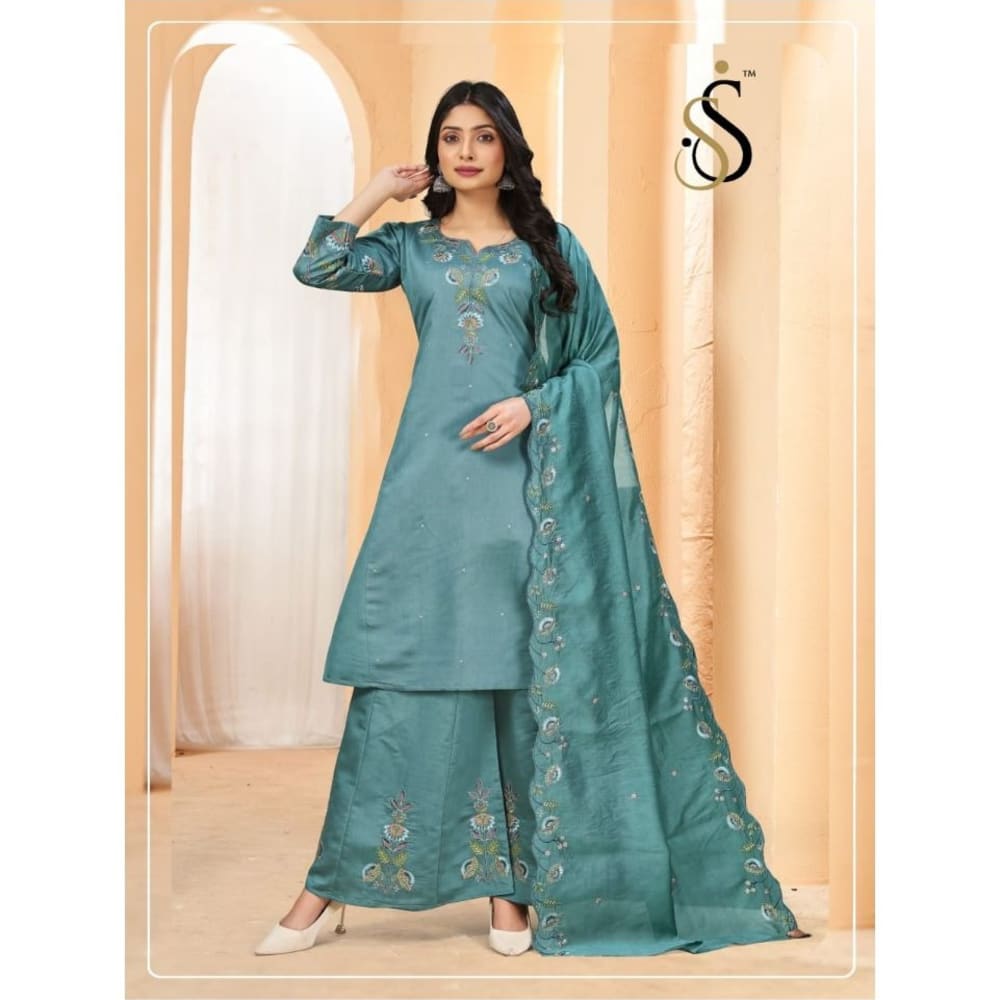 Teal, White, Green Salwar Kameez with Dupatta