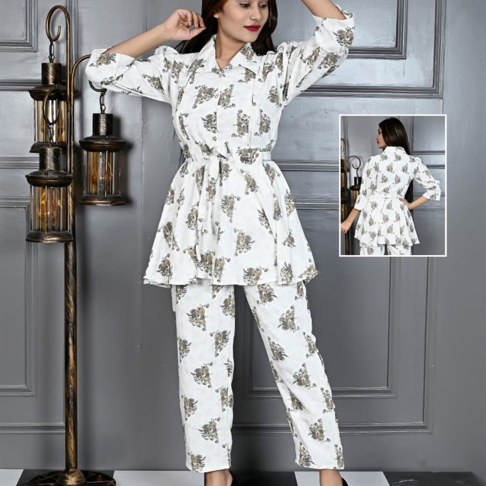 White with a pattern in shades of brown and green Coordinated Set (Top and Trousers)
