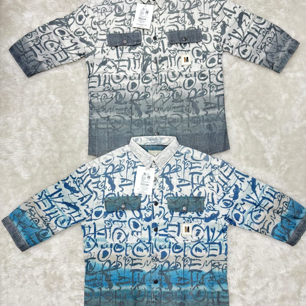 White, gray, and blue with abstract graffiti-style print. Shirt