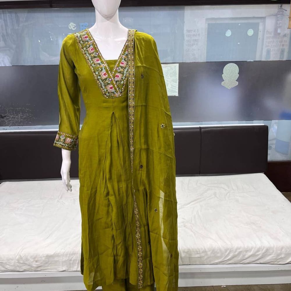 Olive Green with accents of white, pink, and gold Salwar Kameez