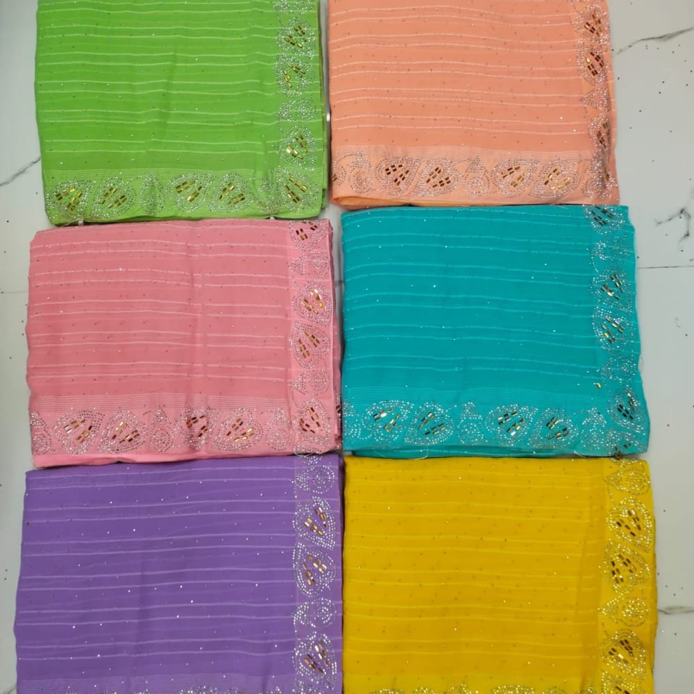 Variety of pastel colors, including green, peach, pink, turquoise, purple, and yellow Saree