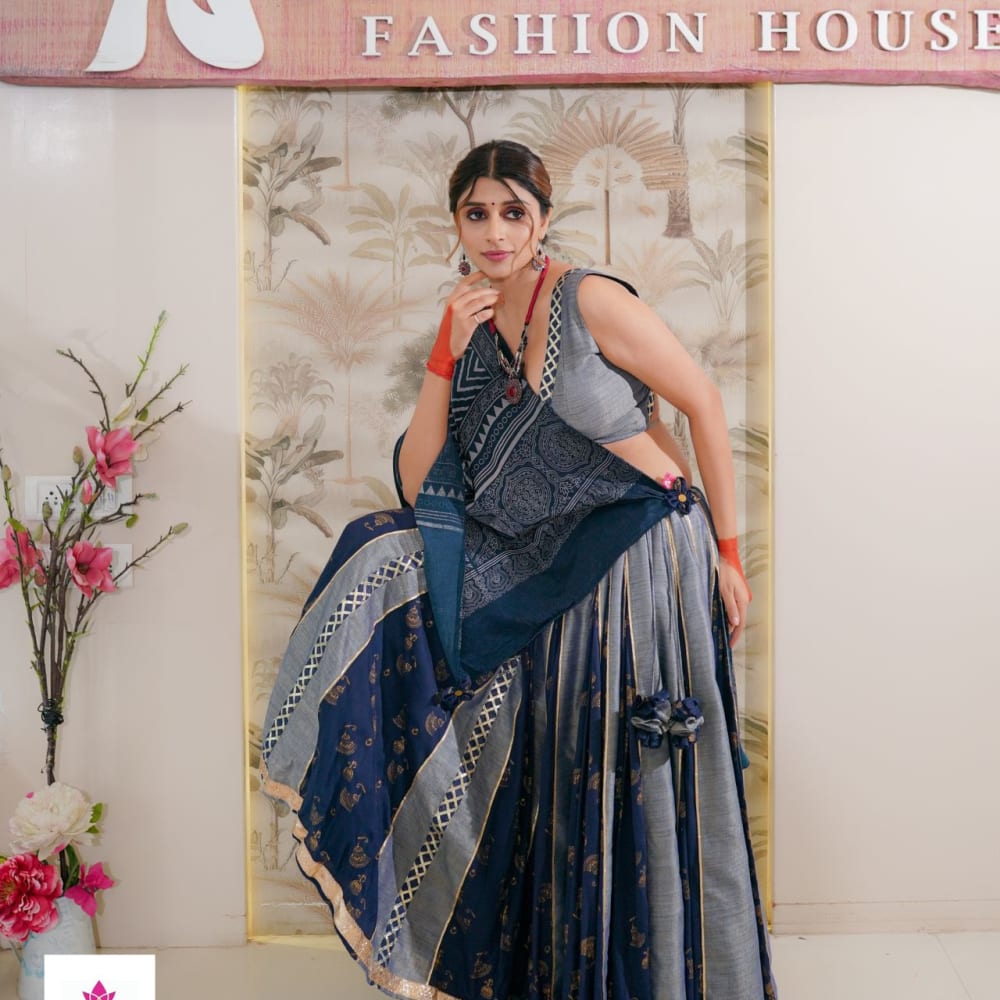 Navy Blue, Gray, Gold Lehenga Choli