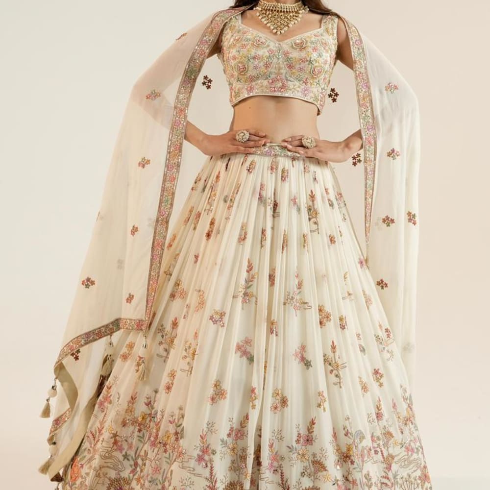 Ivory, with a multi-colored floral print including shades of pink, orange, yellow, and green Lehenga Choli