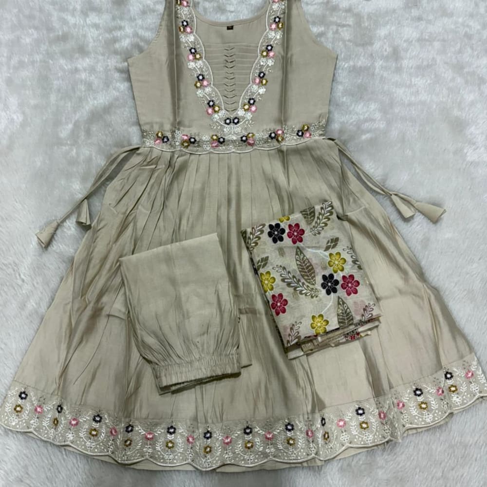 Beige, with floral accents in pink, yellow, black and white Anarkali Suit