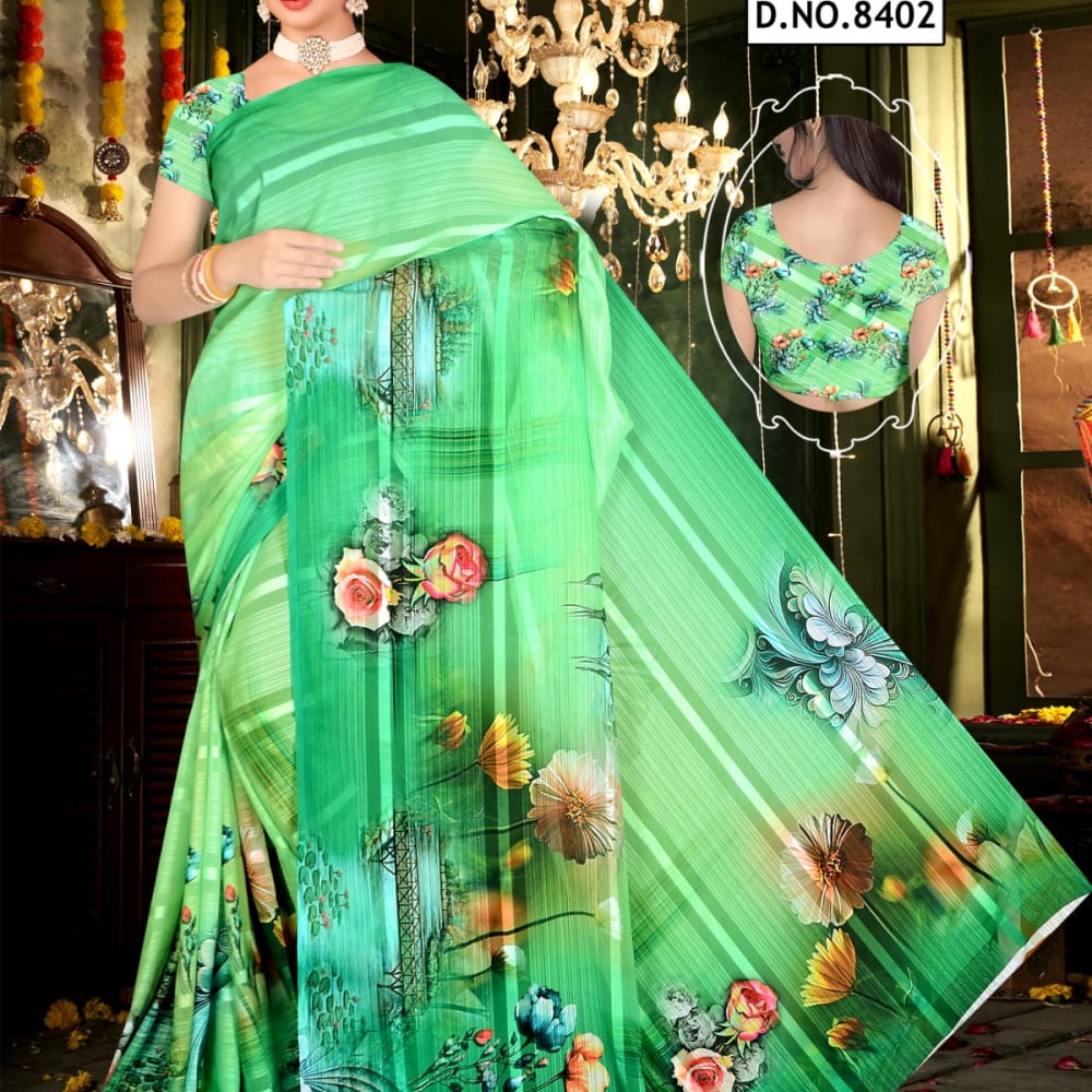 Green, with floral patterns in various colors Saree