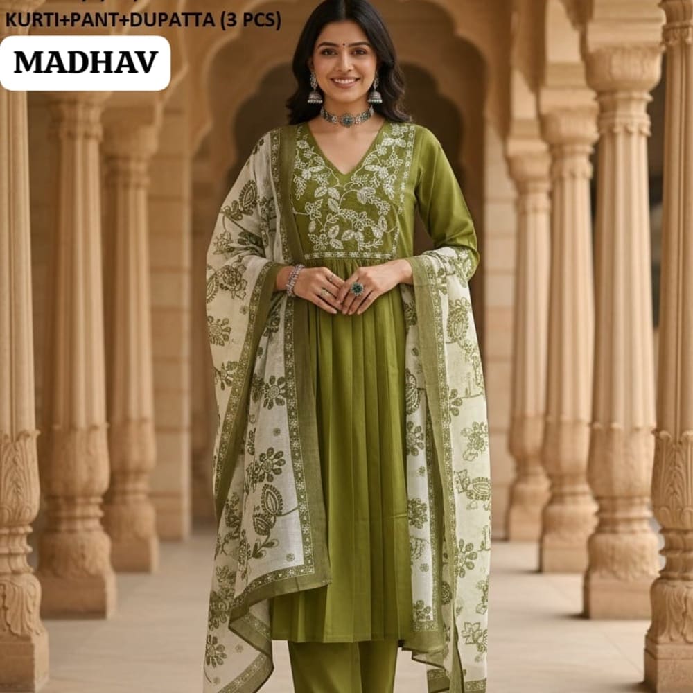 Olive Green, White Kurti, Pant, Dupatta (3 pcs)