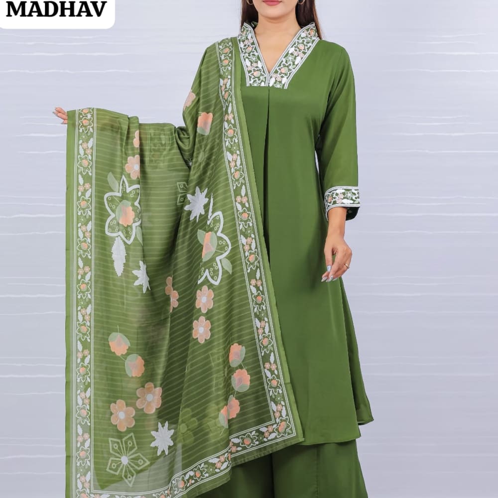 Olive Green, White, Peach Kurta Set with Dupatta