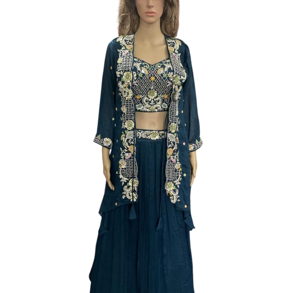 Teal, with accents of gold, pink, green, and white embroidery Lehenga Choli with Jacket
