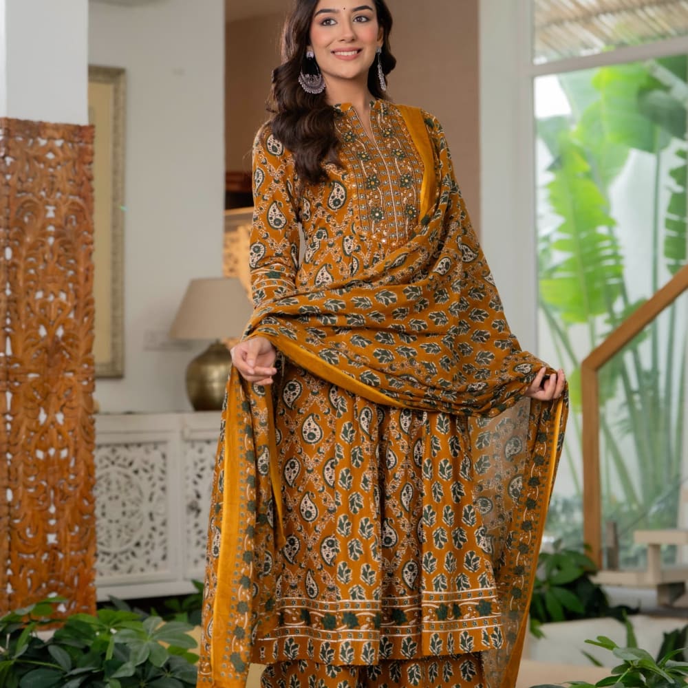 Mustard yellow, green, and white Salwar Kameez with Dupatta