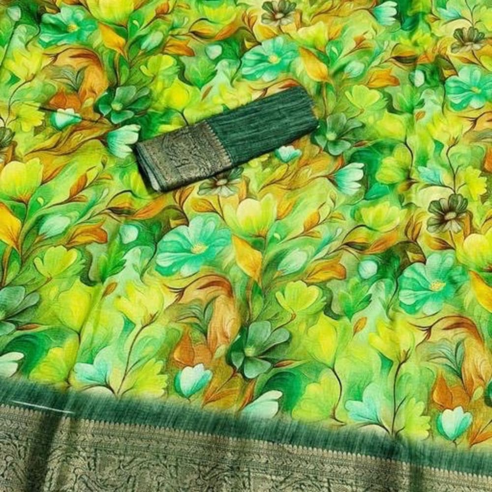 Green, Yellow, Brown, and hints of turquoise Saree