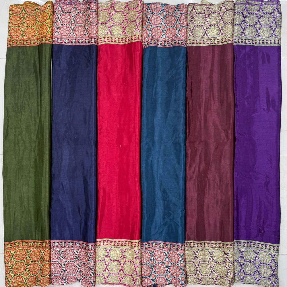 Olive green, navy blue, red, teal, burgundy, and purple with multicolored gold and red accents Saree
