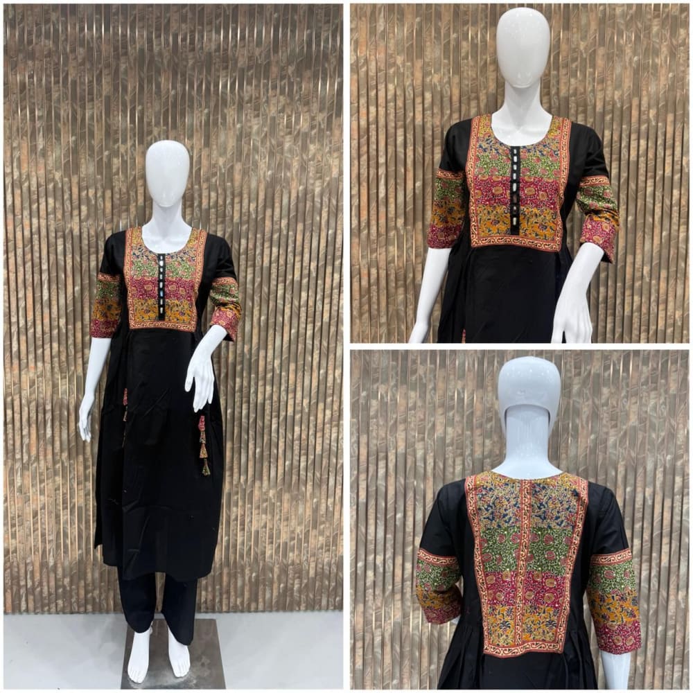 Black, with a multicolor embroidered yoke and sleeves featuring hues of red, green, yellow, and gold. Kurta with PantsCall for price