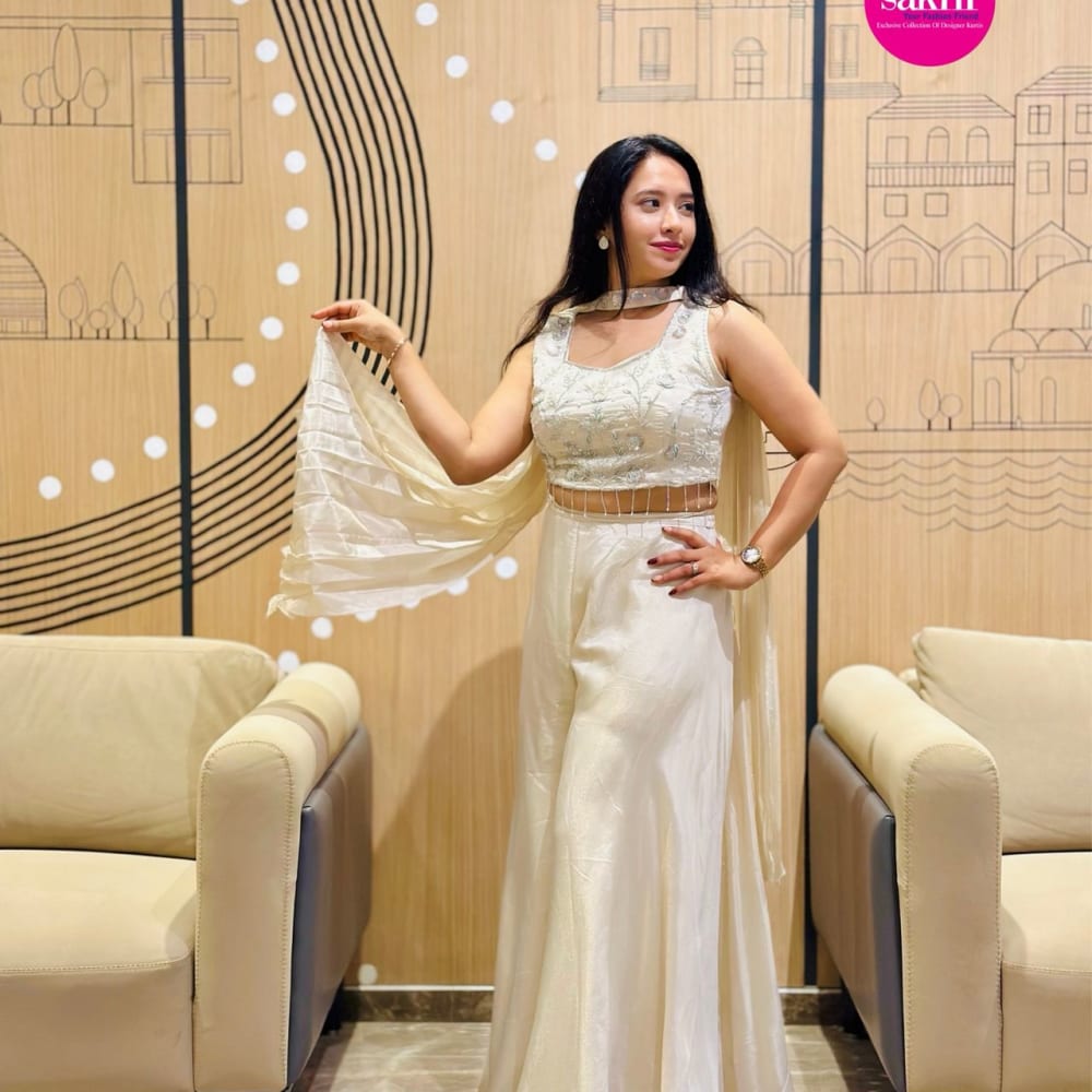 Ivory and subtle silver/pastel accents Crop top, palazzo pants, and shawl set
