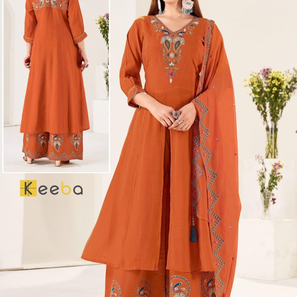 Orange with Multicolor accents Kurta with Palazzo and Dupatta Set