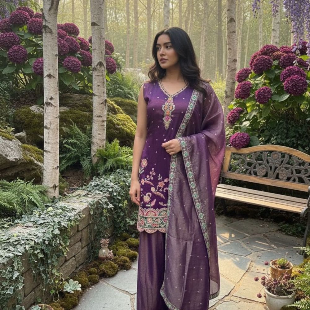 Purple, with accents of pink, green, and gold Salwar Kameez with Dupatta