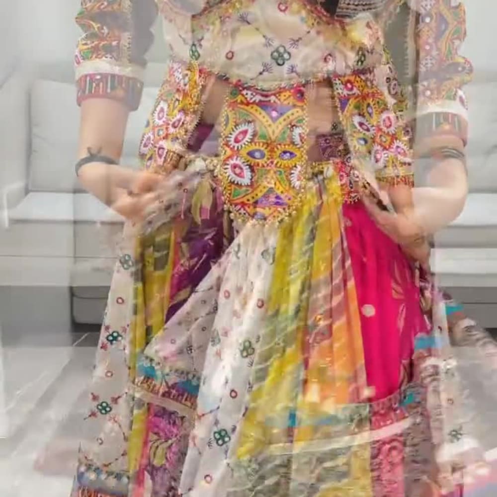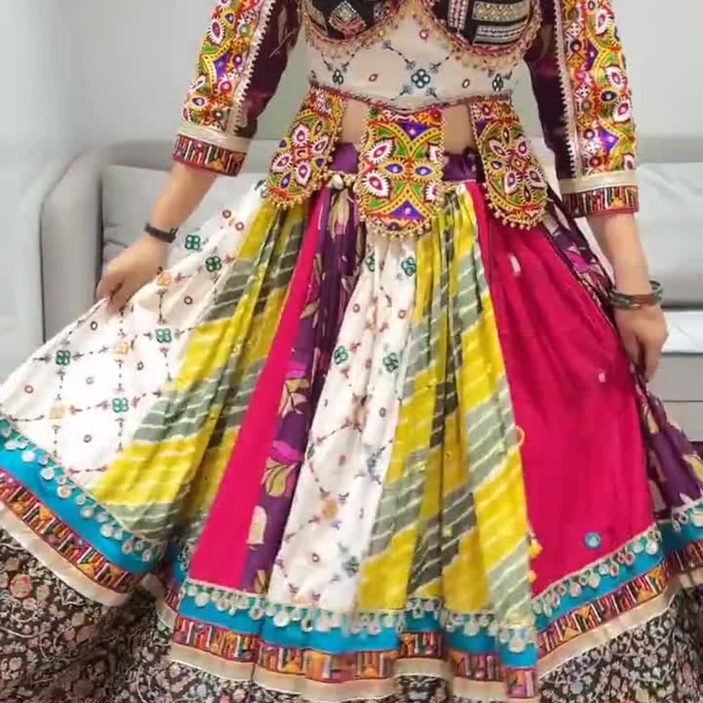 Multicolor, featuring black, white, red, yellow, purple, and green. Dress/Outfit