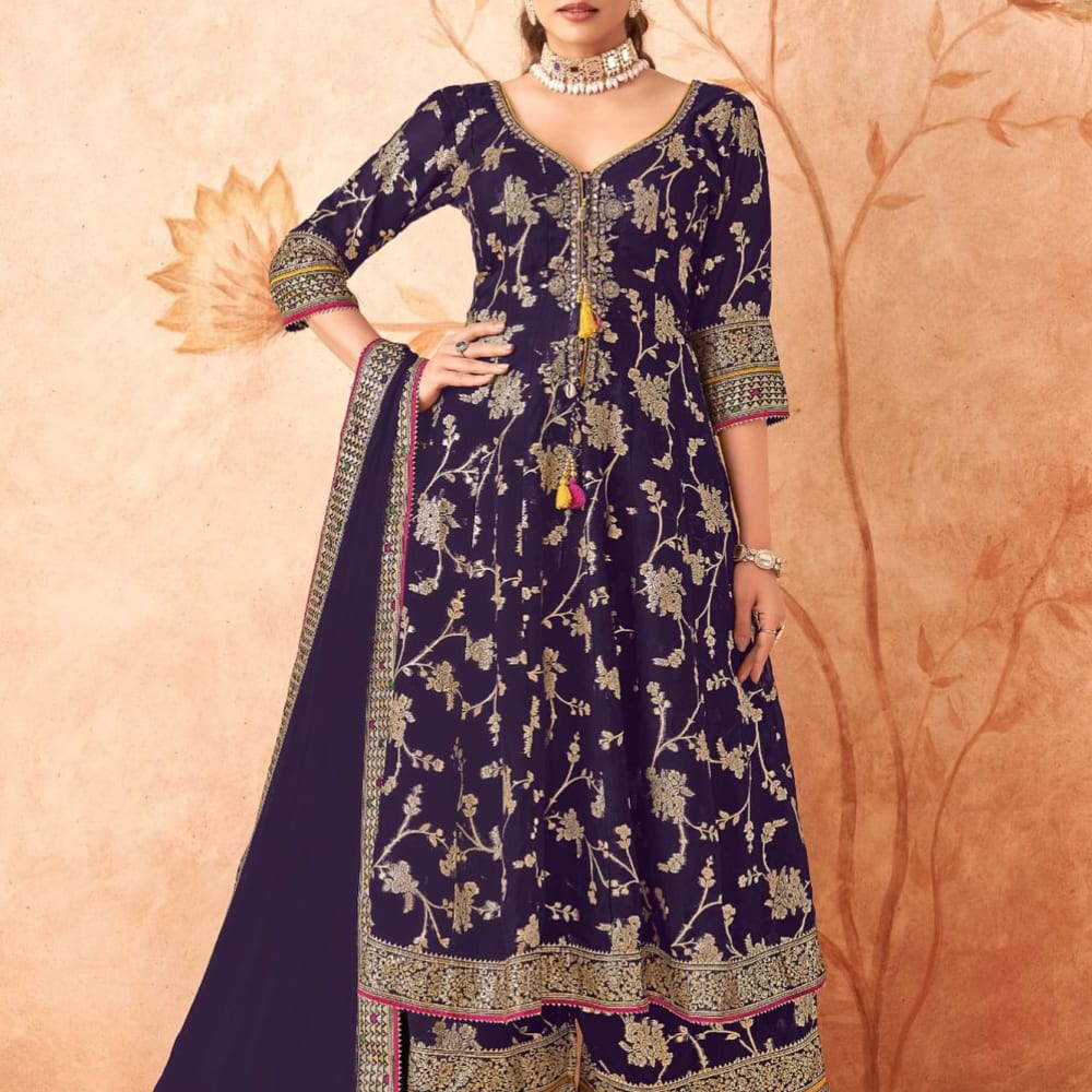 Navy blue and gold, with accents of pink, yellow, and green. Salwar Kameez