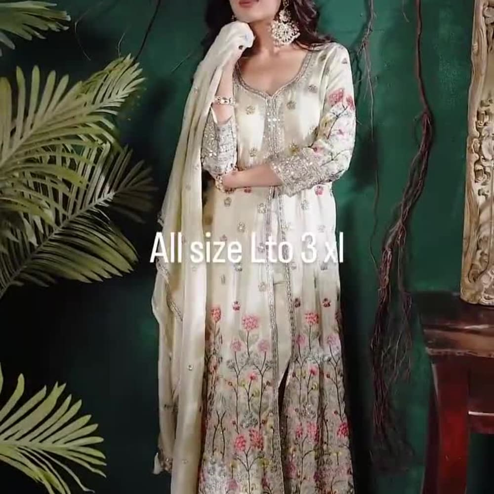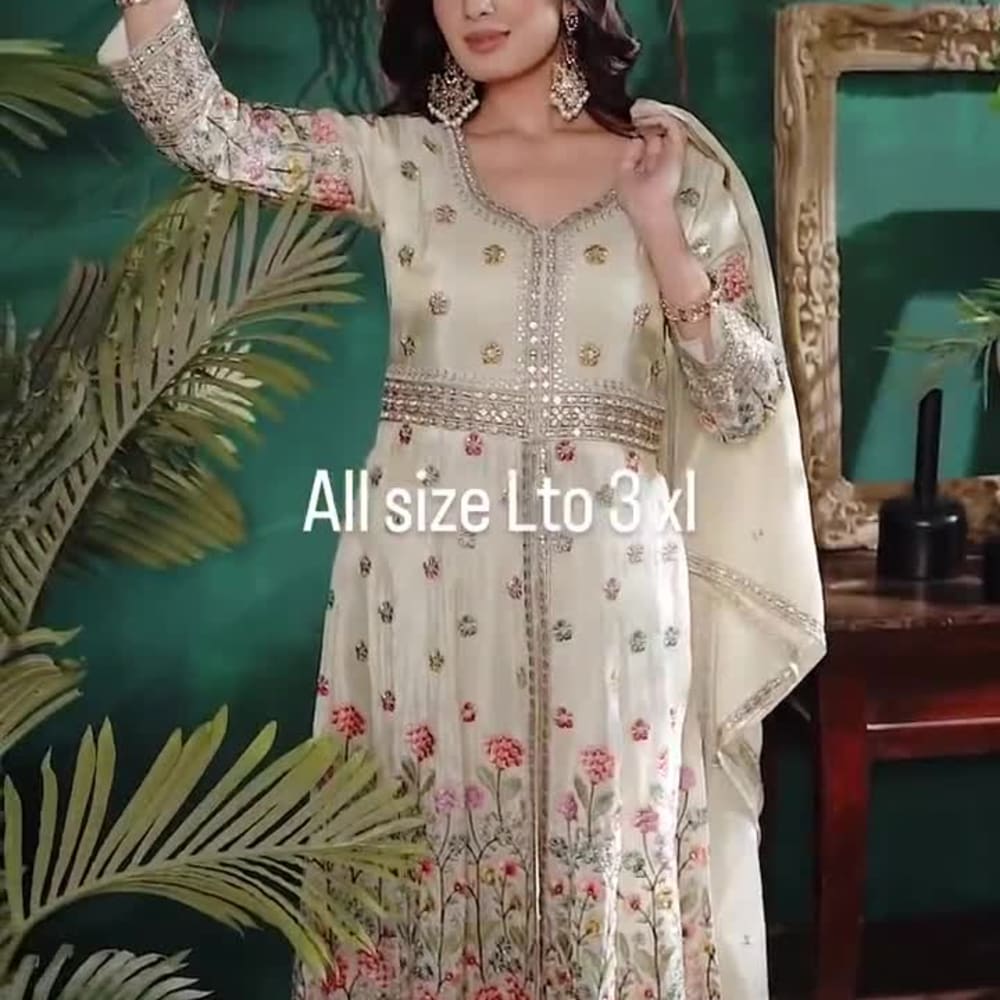 Off-white, with floral print in shades of pink, green, and hints of gold Anarkali Suit with Dupatta
