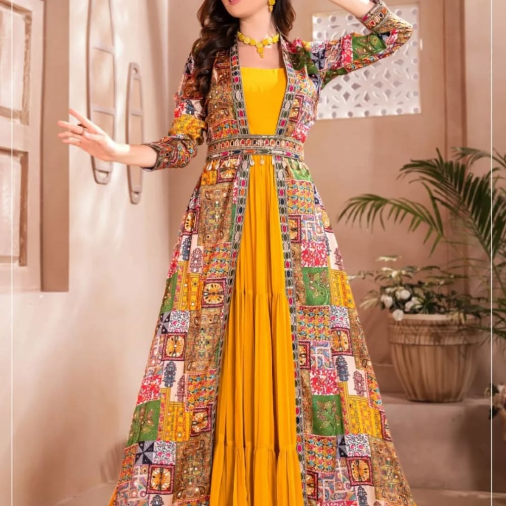 Yellow, Multicolor (Red, Green, Beige, and hints of others) Dress with Jacket
