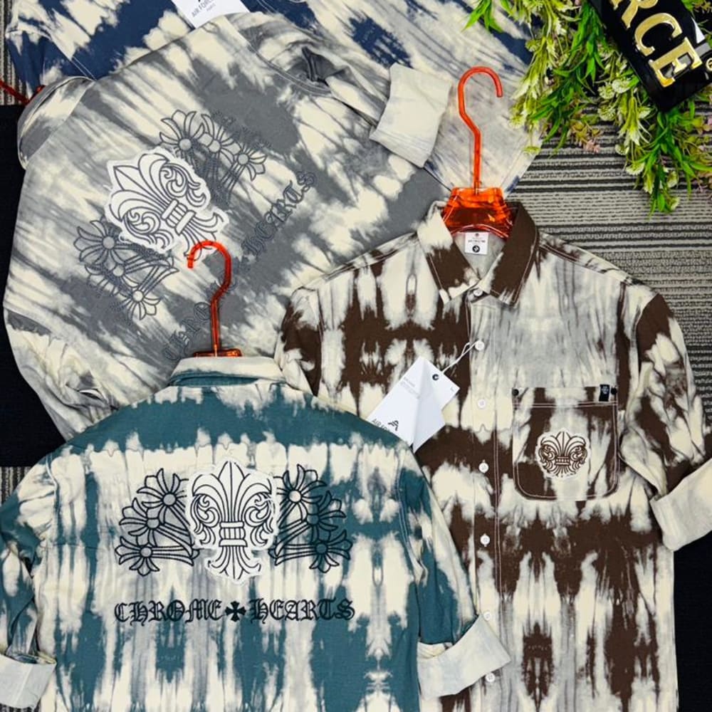 Various shades of blue, gray, and brown combined with white in a tie-dye effect. Shirt