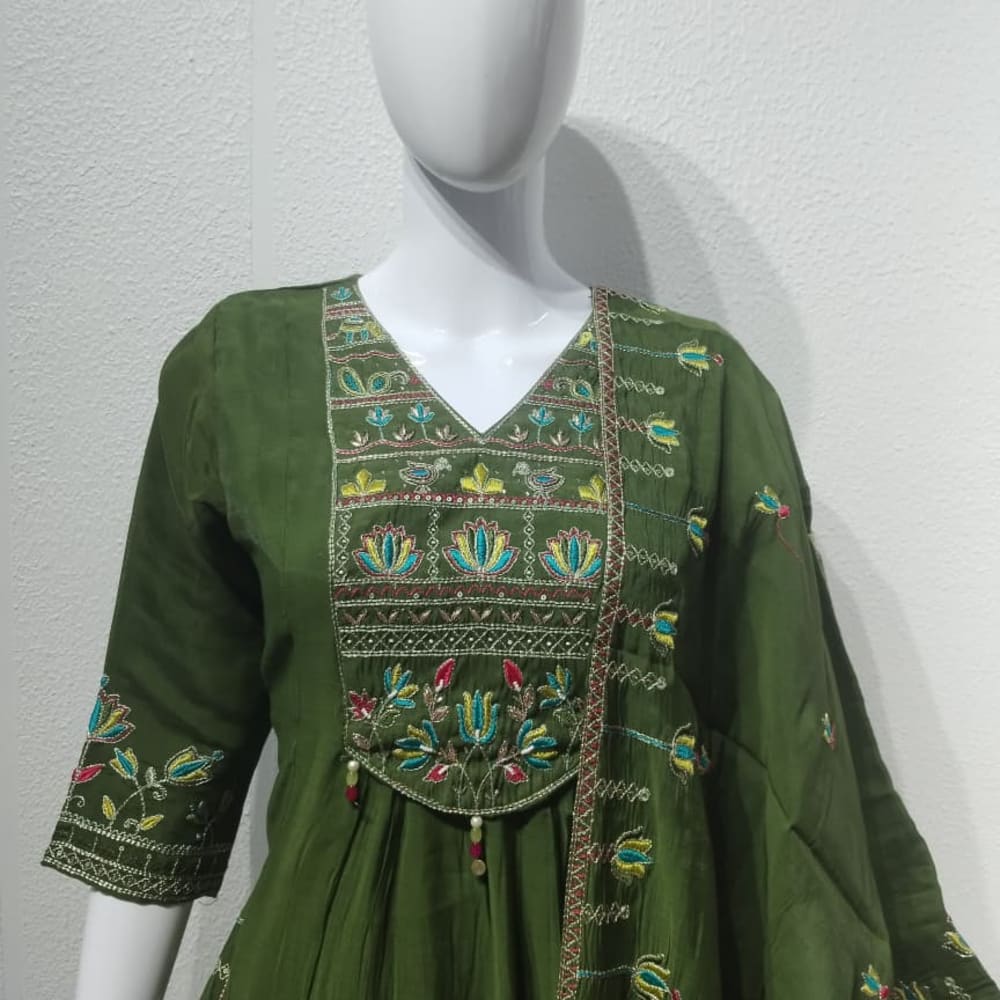 Olive Green with Multicolor Embroidery Kurti with Dupatta