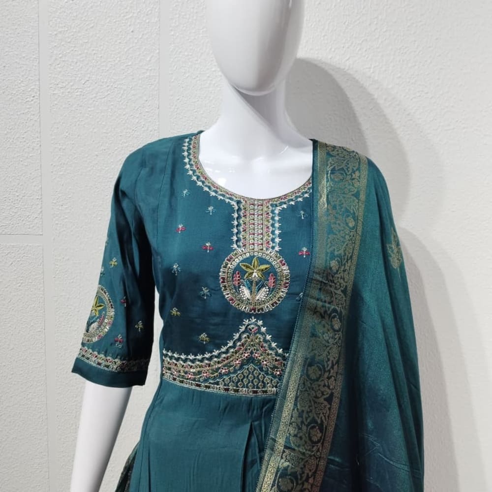 Teal, Gold, Multi-colored embroidery Anarkali Suit with Dupatta