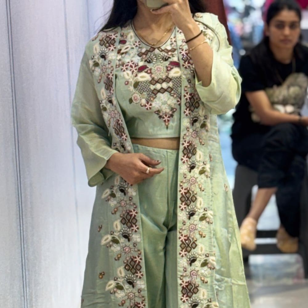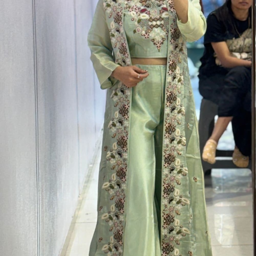 Light Green, with accents of brown, beige, and red Co-ord Set with a jacket