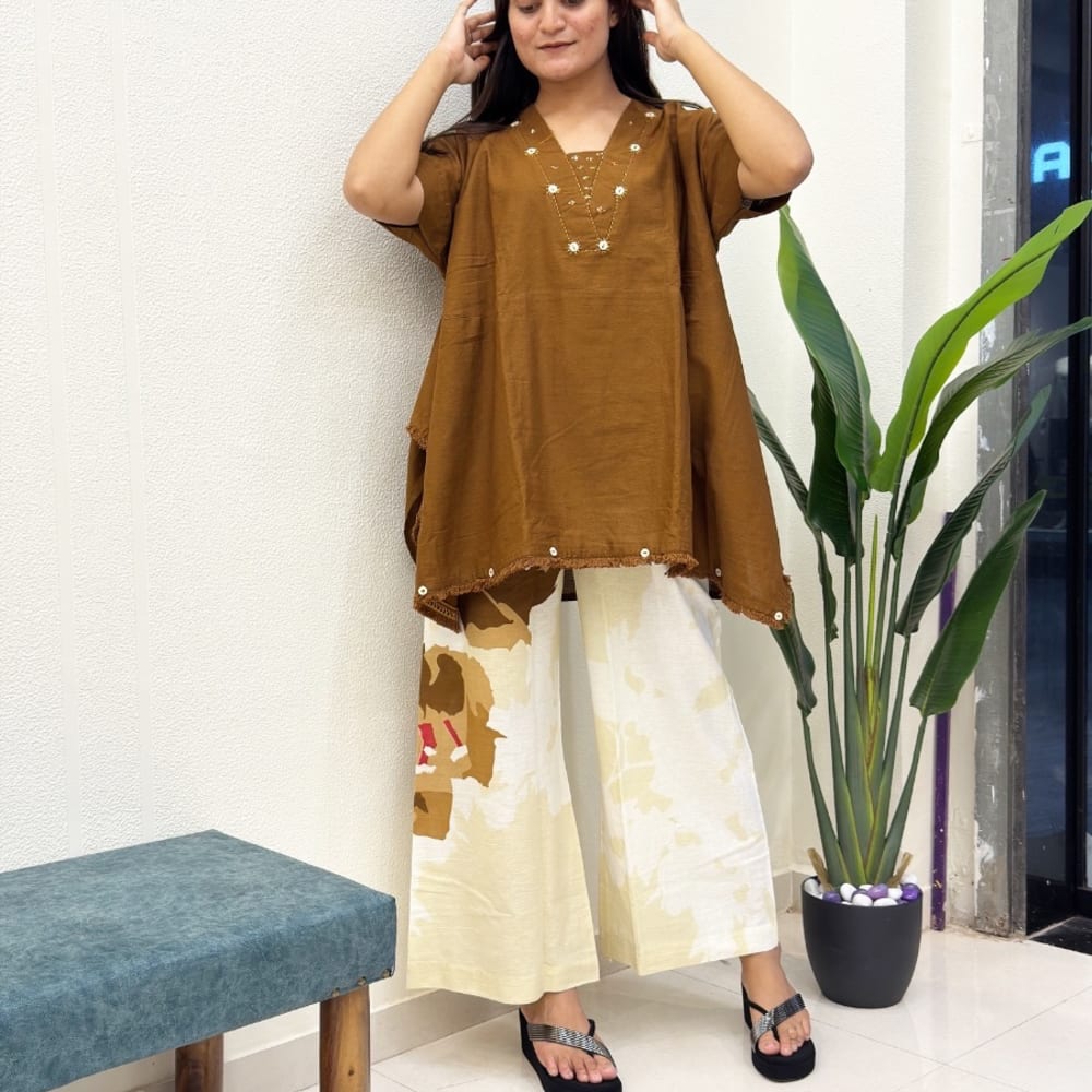 Brown and White Kurti and Palazzo Set
