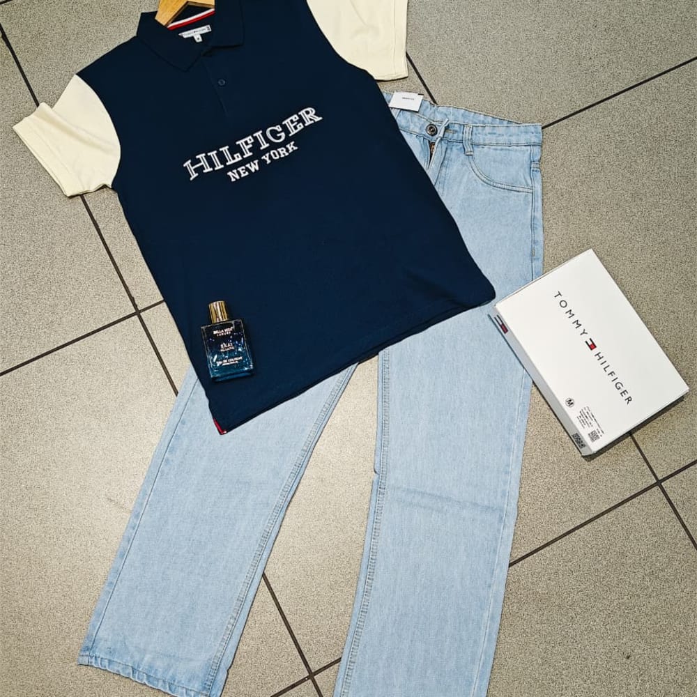 Navy Blue, Cream, and Light Blue Polo Shirt and Jeans