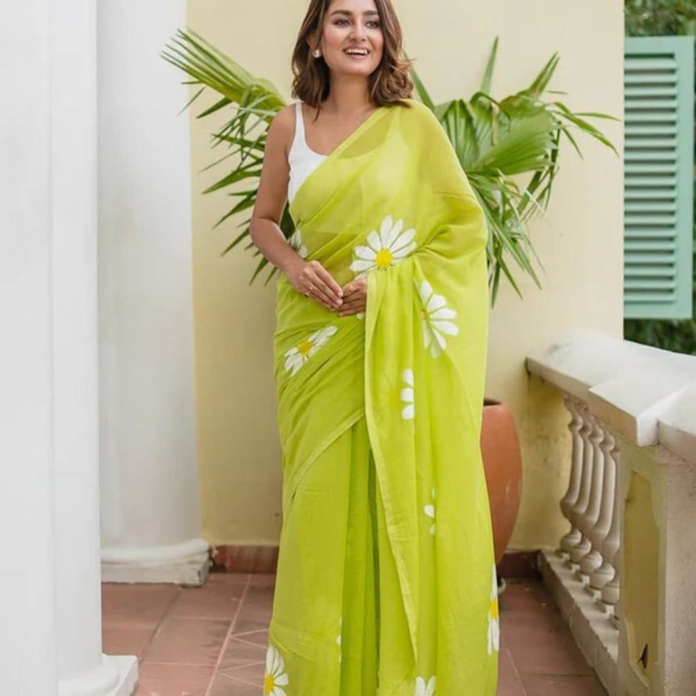 Lime green and White Saree