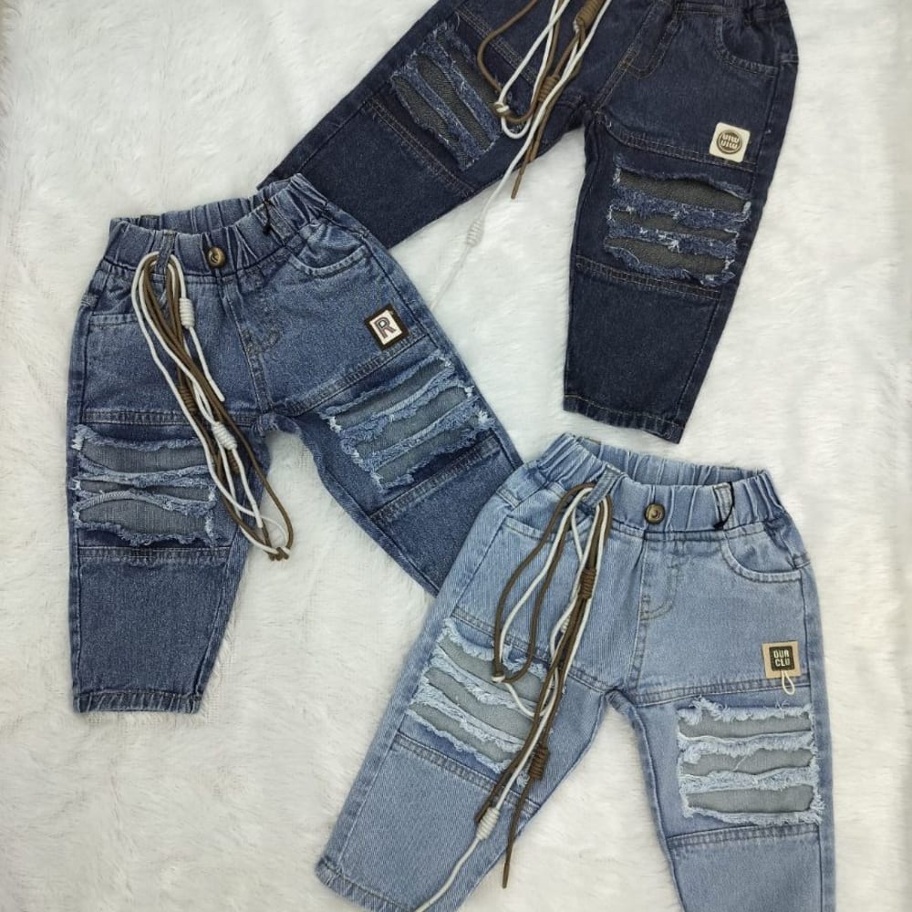Various shades of blue denim with patches of lighter denim, and brown and white drawstrings Jeans