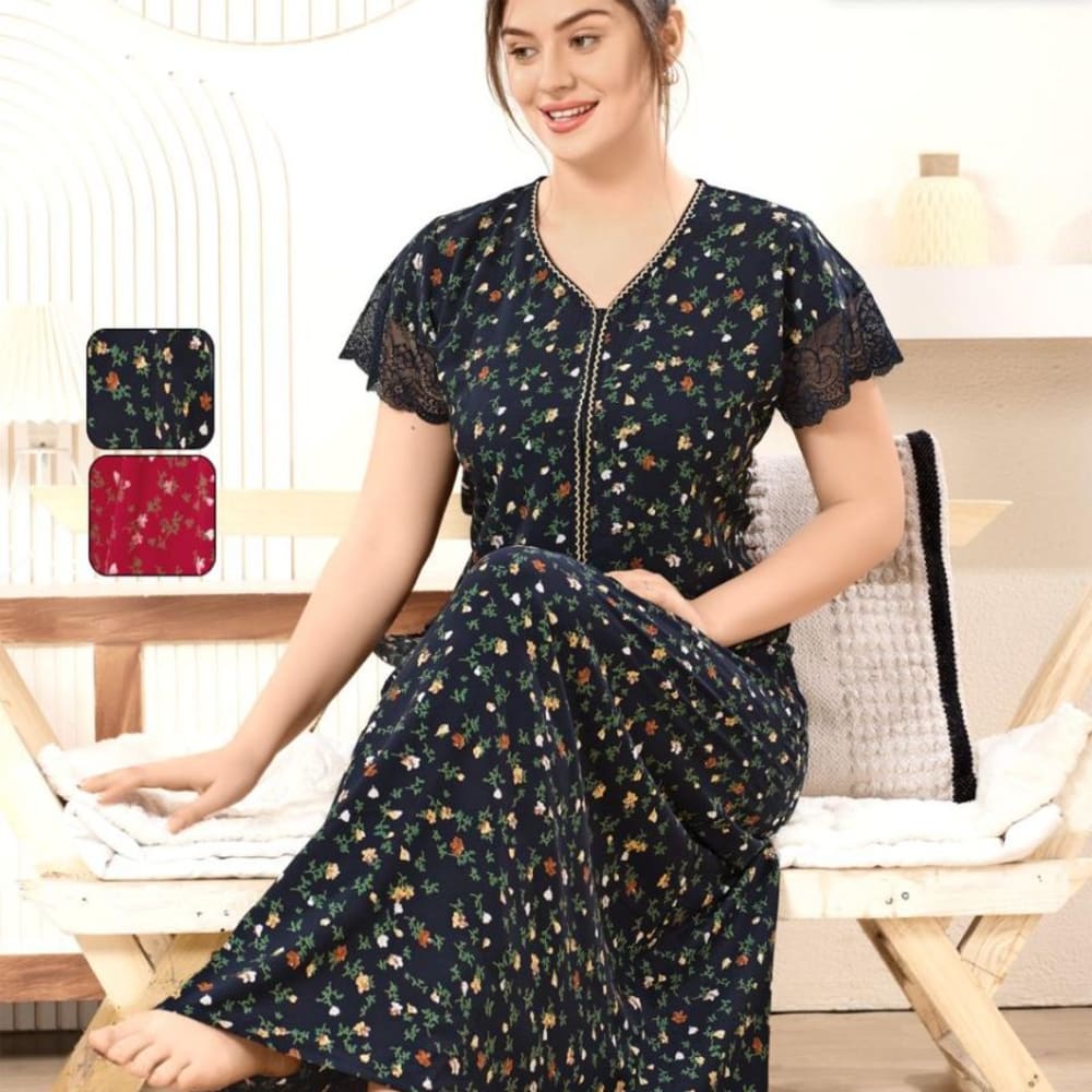 Navy blue with floral print, white, orange, and green accents Nightgown