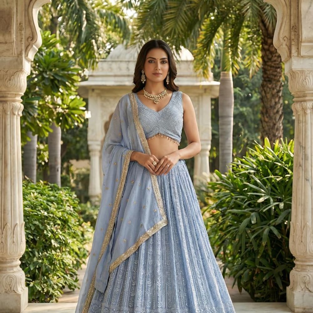 Powder Blue and Gold Lehenga Choli