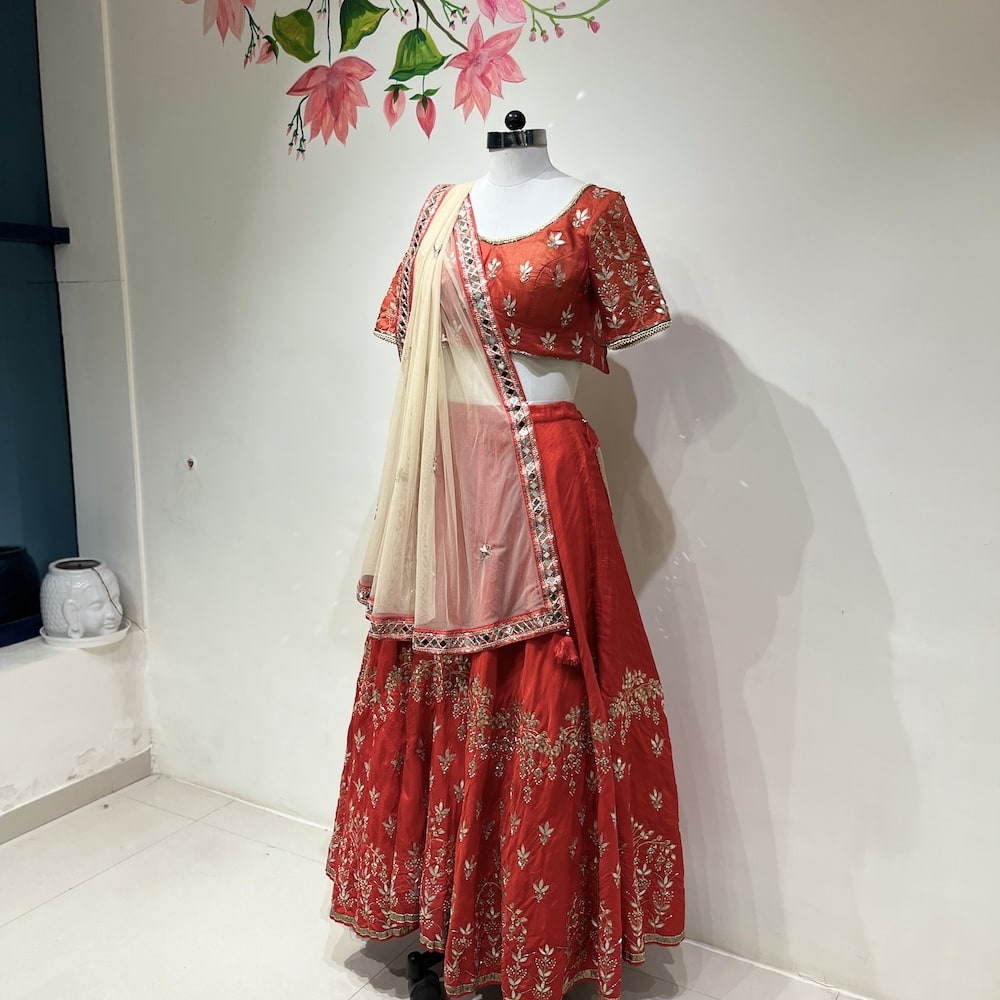 Red, Gold, and Beige Lehenga Choli