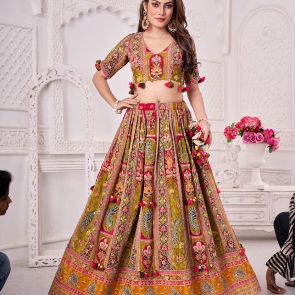 Olive green, red, pink, yellow, gold Lehenga Choli