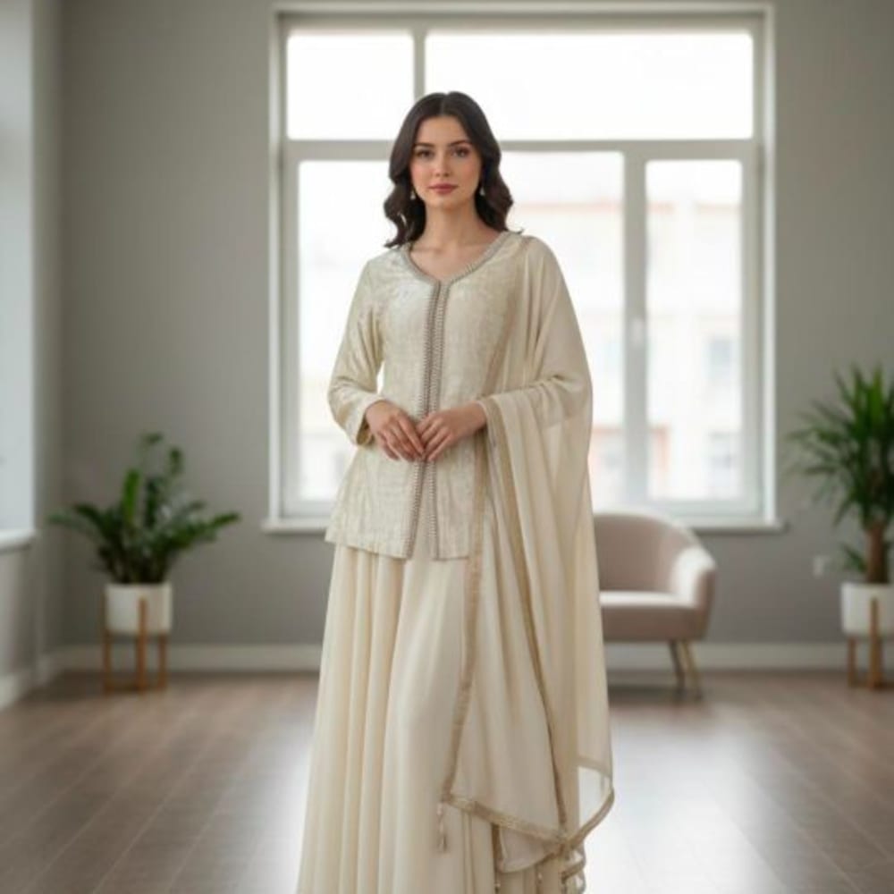 Ivory and gold Sharara suit with a jacket top and a dupatta