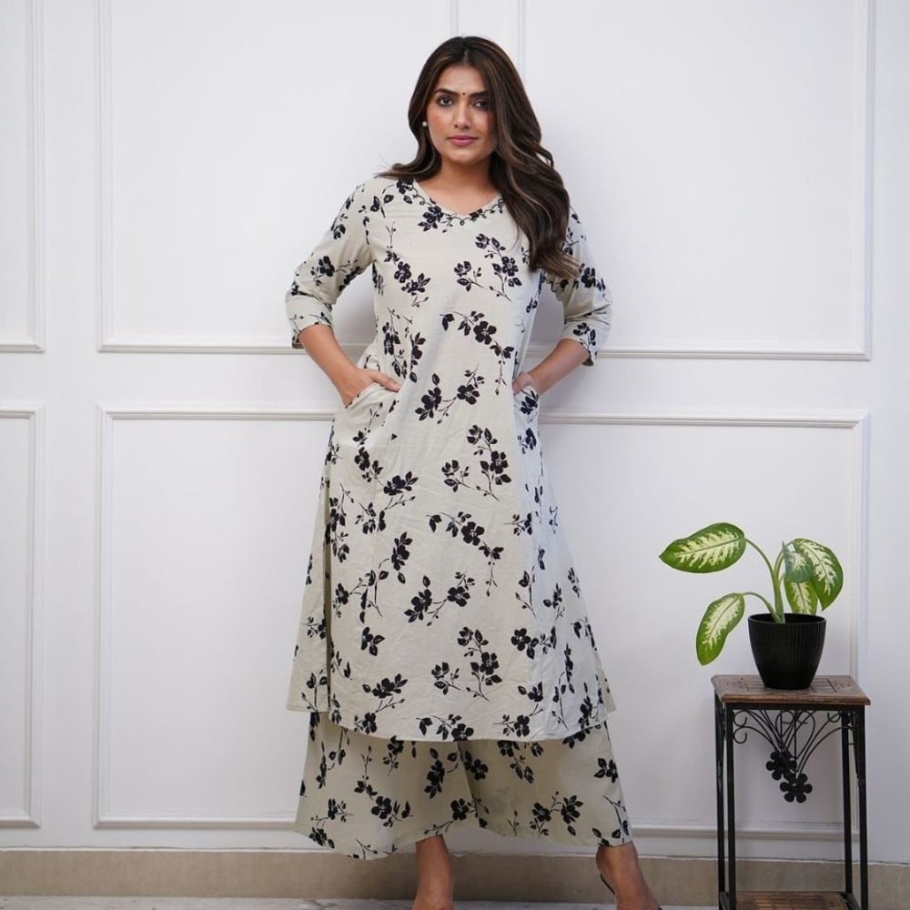 Off-White and Black Kurta and Palazzo Set