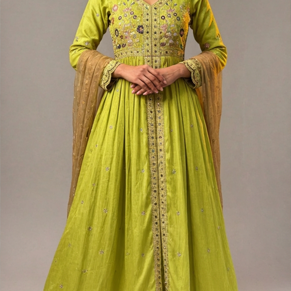 Lime Green, with accents of gold, pink, purple, and brown Dress