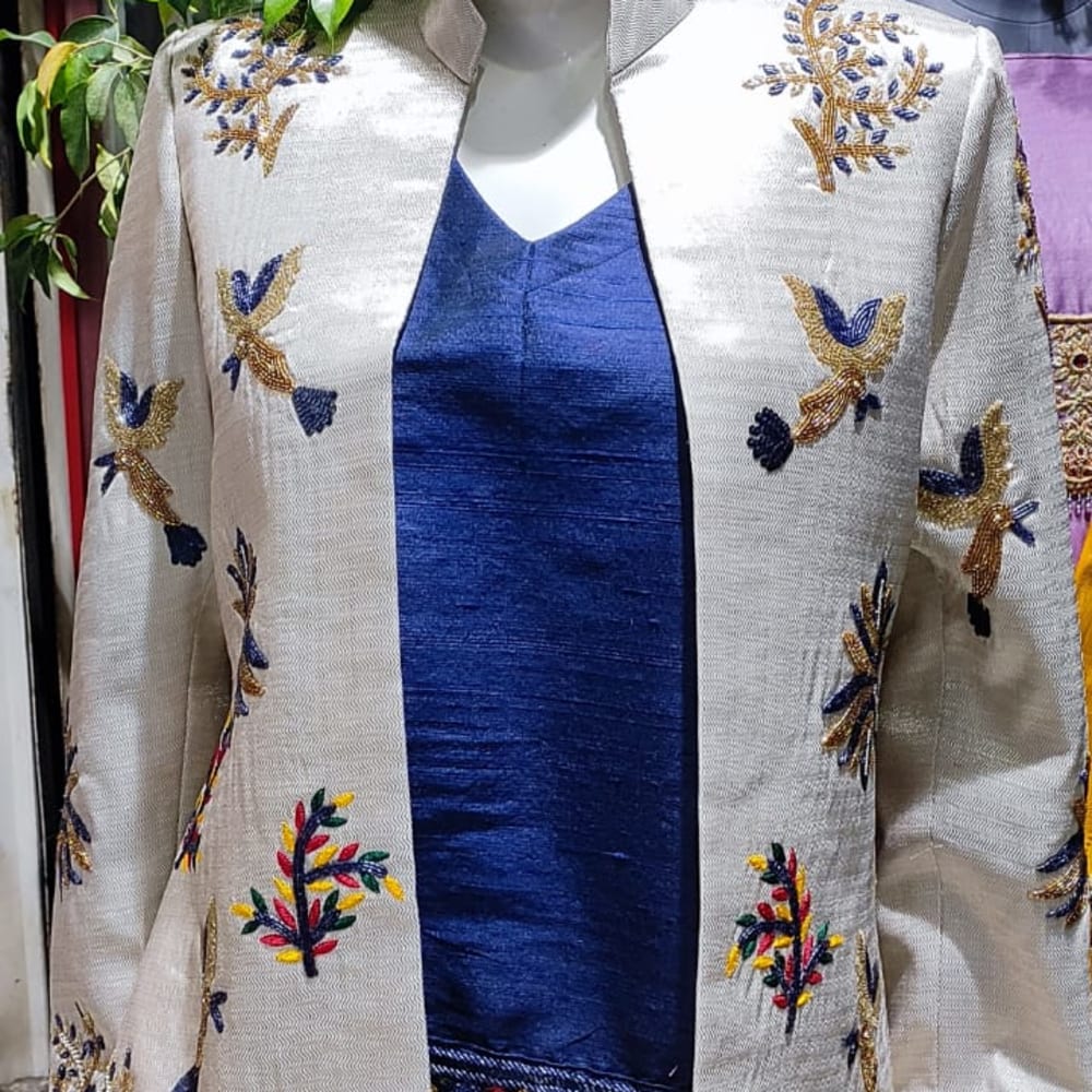 Off-white, Blue, Gold, Yellow, Red, Green Jacket (over a dress/kurti)