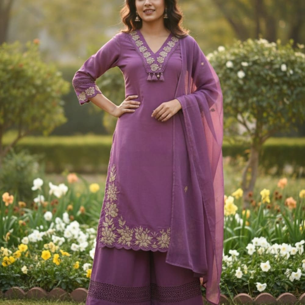Purple Kurta Set with Palazzo Pants and Dupatta