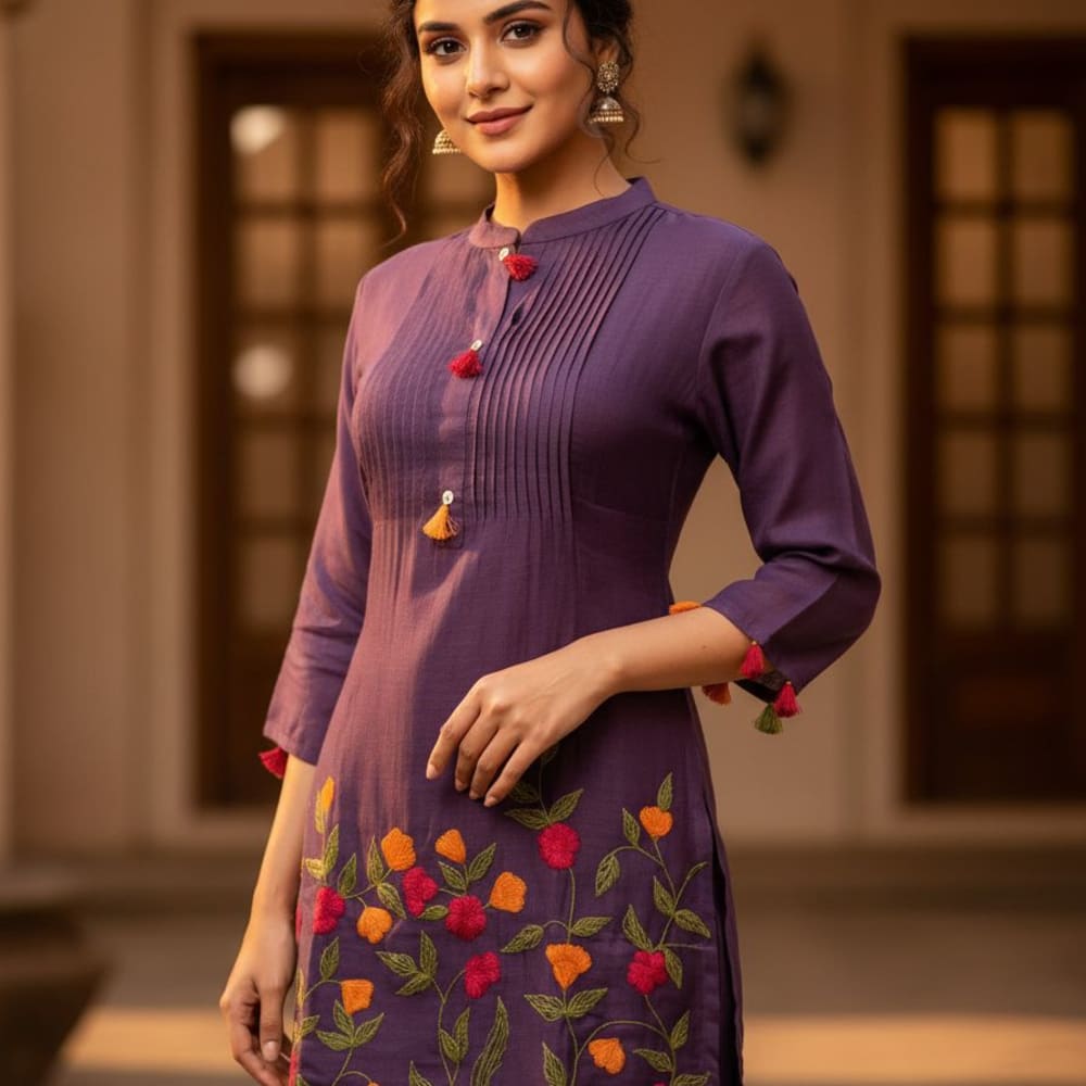 Purple with floral embroidery in red, orange, and green Kurta