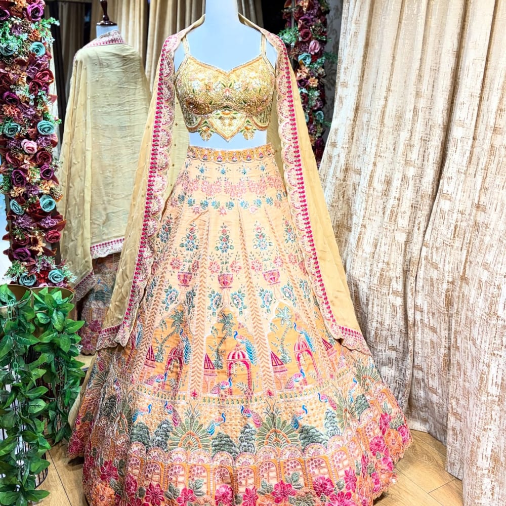 Peach, Gold, Pink, Teal, Green Lehenga Choli