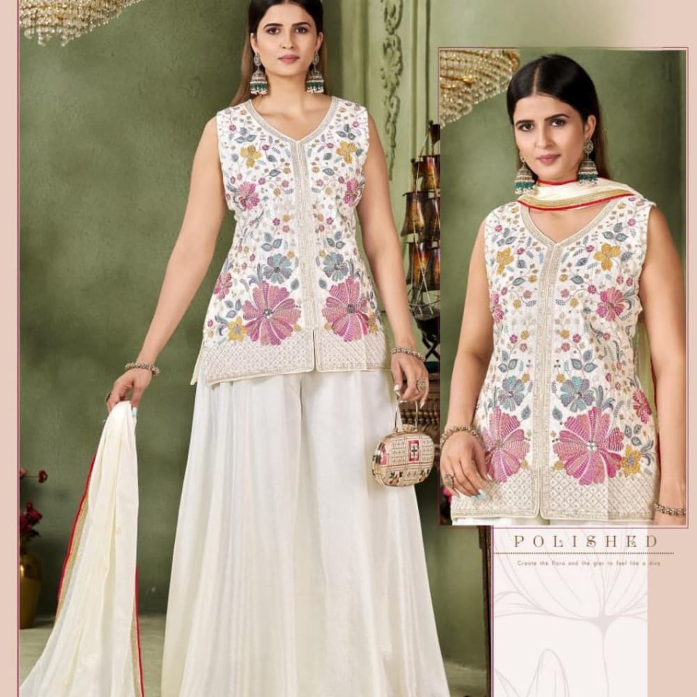 White with pink, blue, yellow, and green floral embroidery Sharara Set